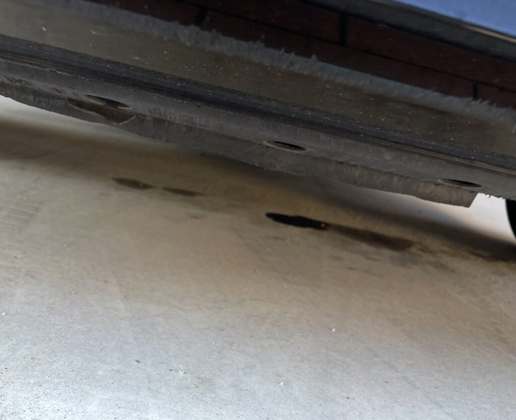 実際に底から車を見させてもらうと、ベッコリ凹んだオイルパン(タンク)が確認できました